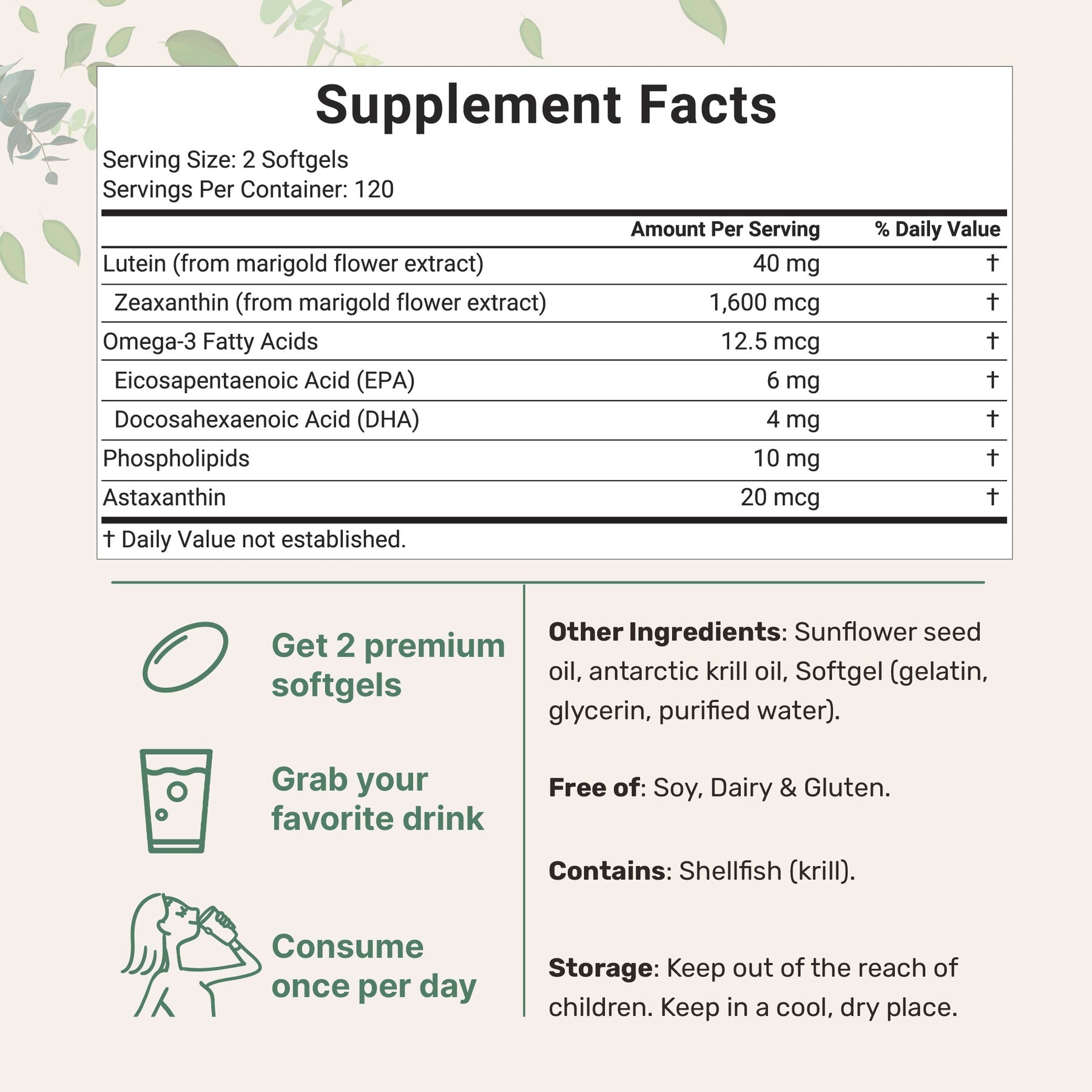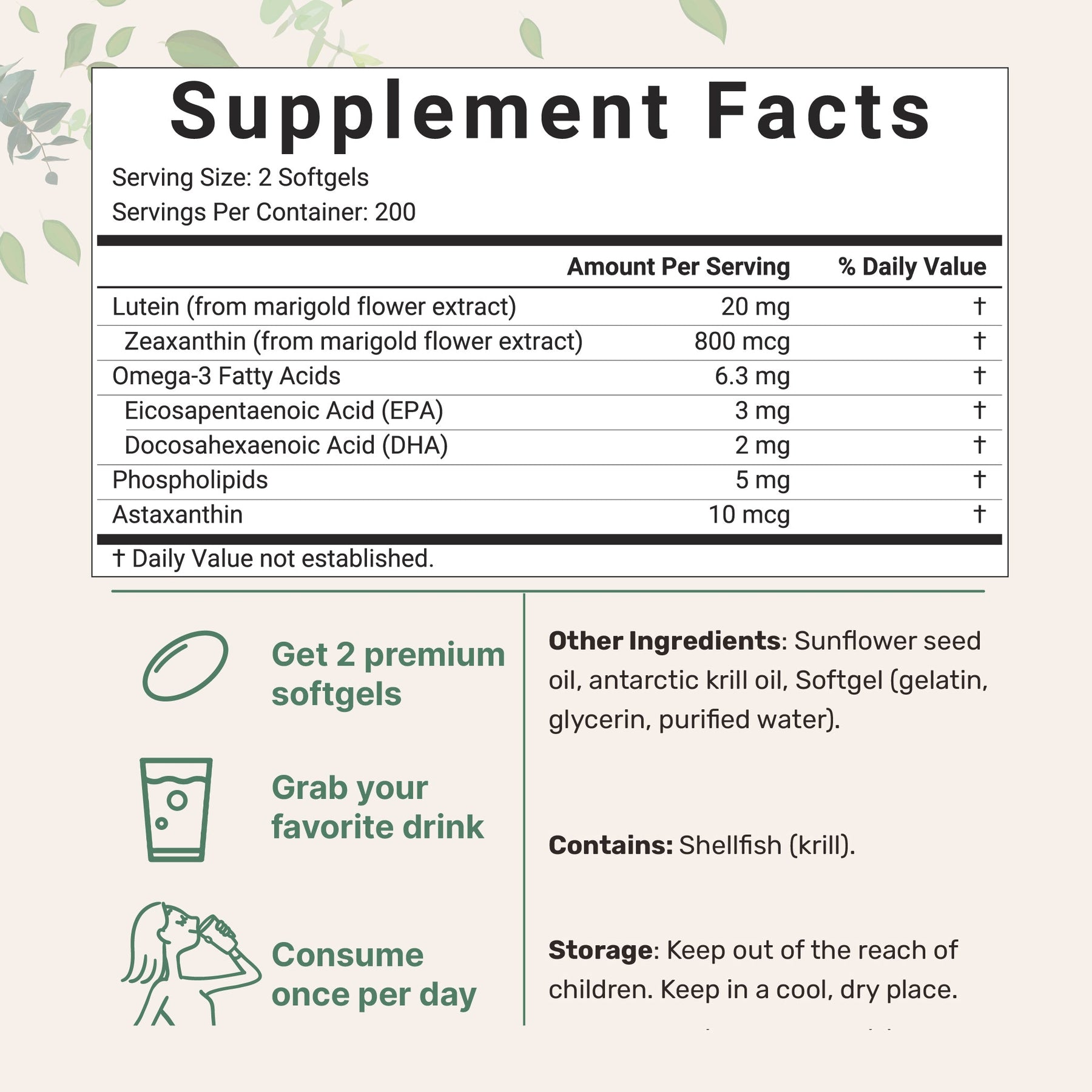• For 20mg 400 Count package: 400 total softgels that provide easily absorbed ingredients with a virgin sunflower seed oil base. 2 softgel serving size that contains 20mg lutein, 800mcg zeaxanthin, 10mcg astaxanthin, 6.3mg omega-3 fatty acids, and 5mg phospholipids.