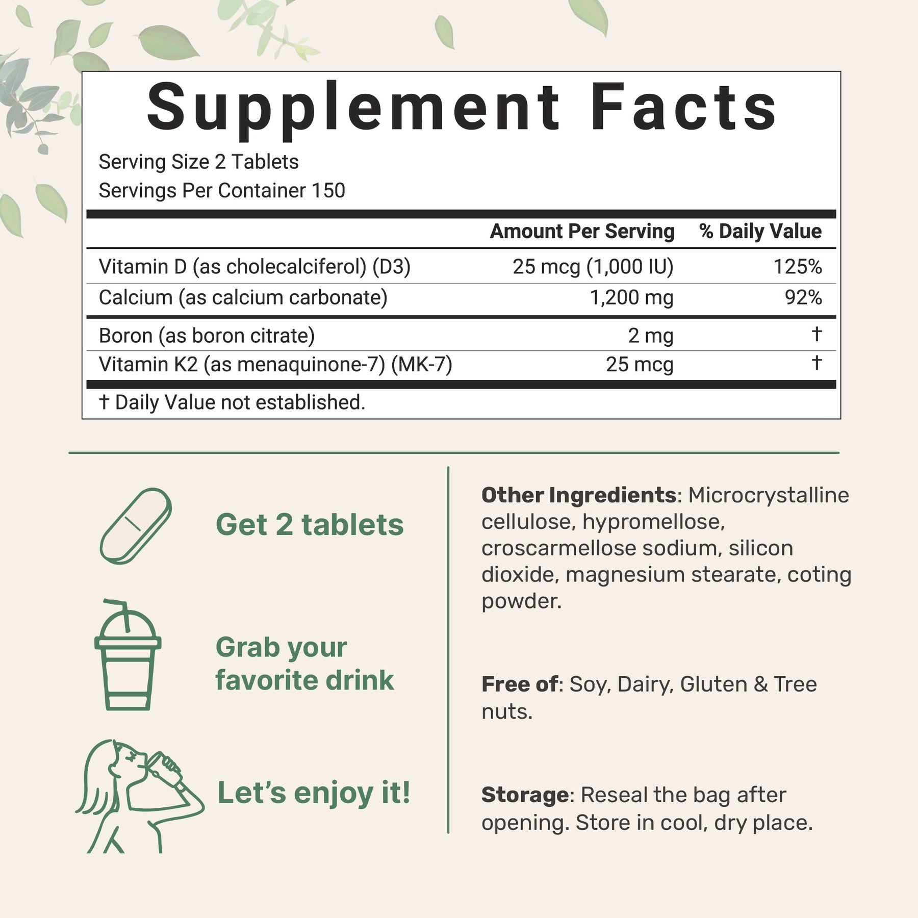 • Each pouch contains 300 coated, bisected tablets, providing 25 mcg (1,000 IU) of vitamin D3, 25 mcg of vitamin K2, 1,200 mg of calcium, and 2 mg of boron per serving.