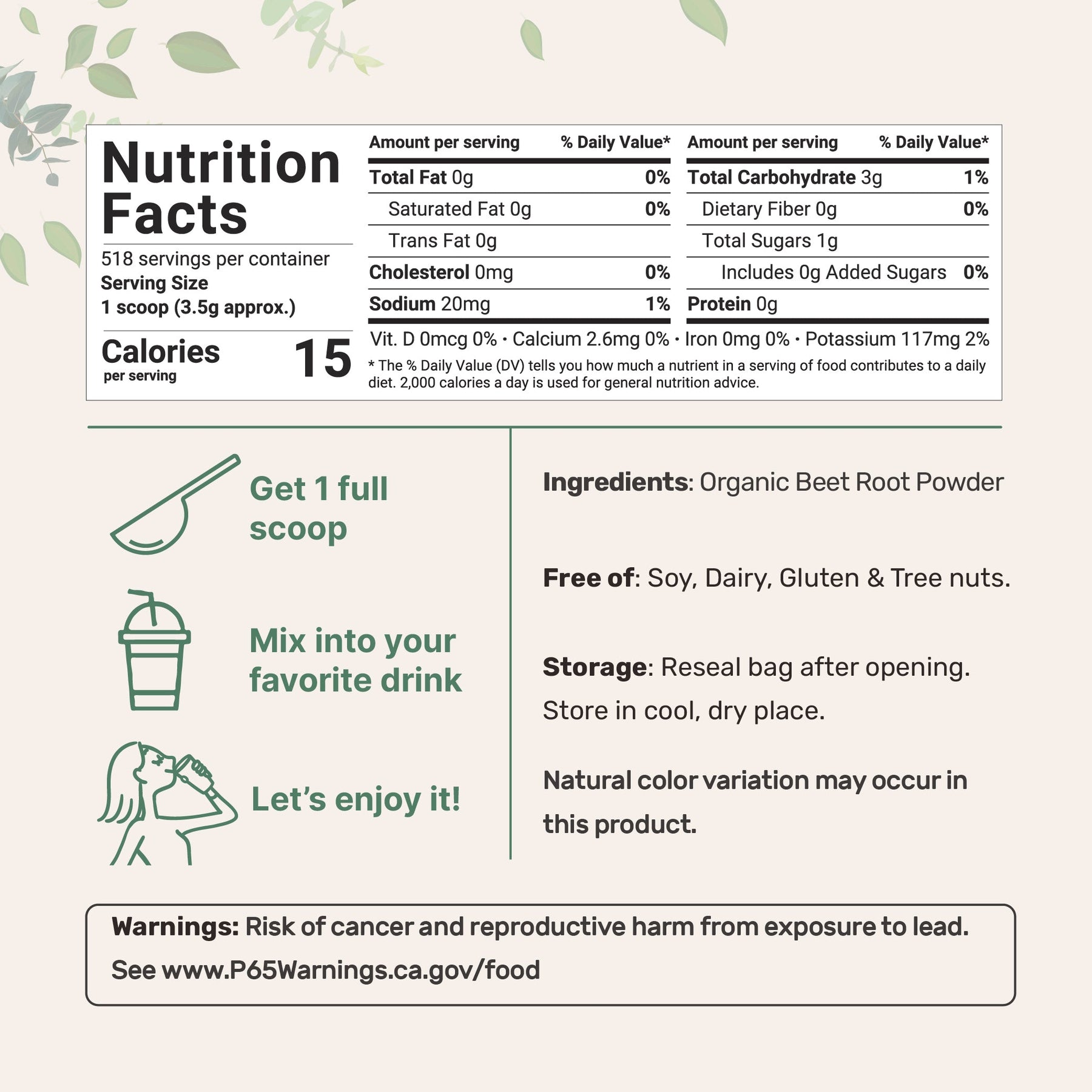 Enjoy 4lbs of fresh beet root powder, approximately 3.5 grams per scoop, up to 518 days’ worth of servings.