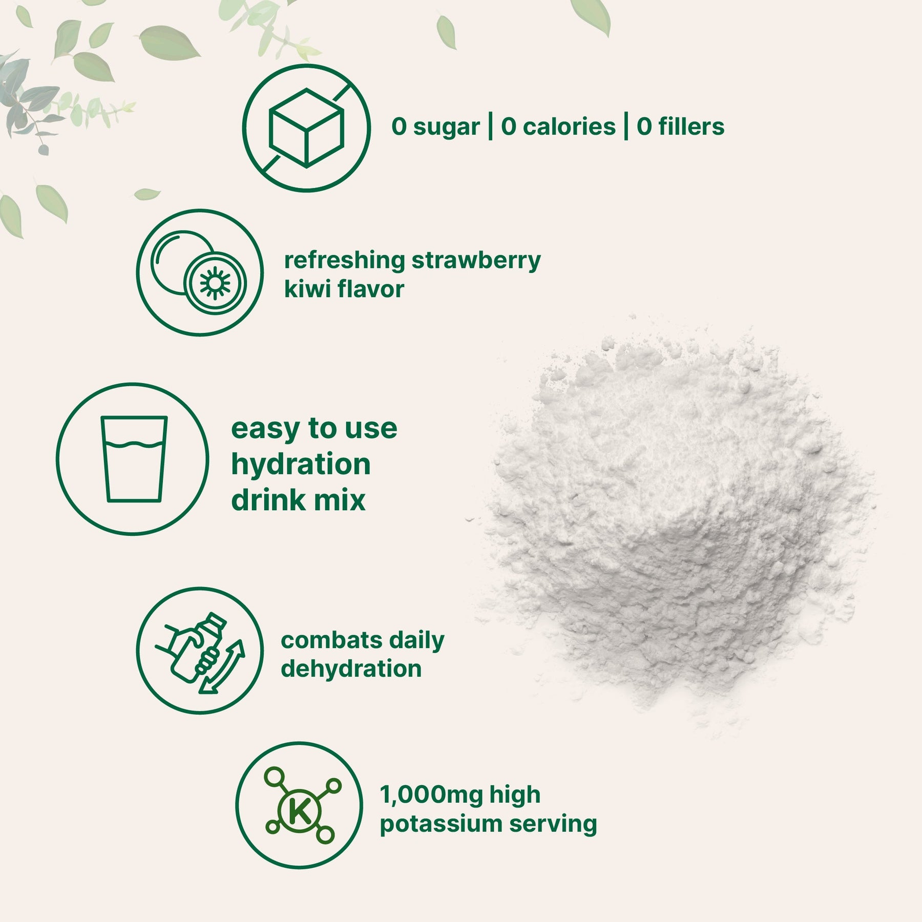 Micro Ingredients offers Electrolyte Powder with a natural strawberry kiwi flavor and 0 sugar, 0 calories, and 0 fillers. A low-sodium and high-potassium hydration formula made with essential electrolytes from potassium, magnesium, and calcium.