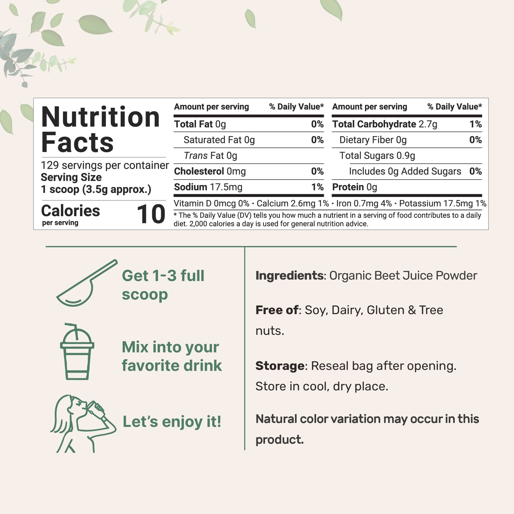 Enjoy 1lb of fresh beet root juice powder, approximately 3.5 grams per scoop, up to 129 days’ worth of servings.