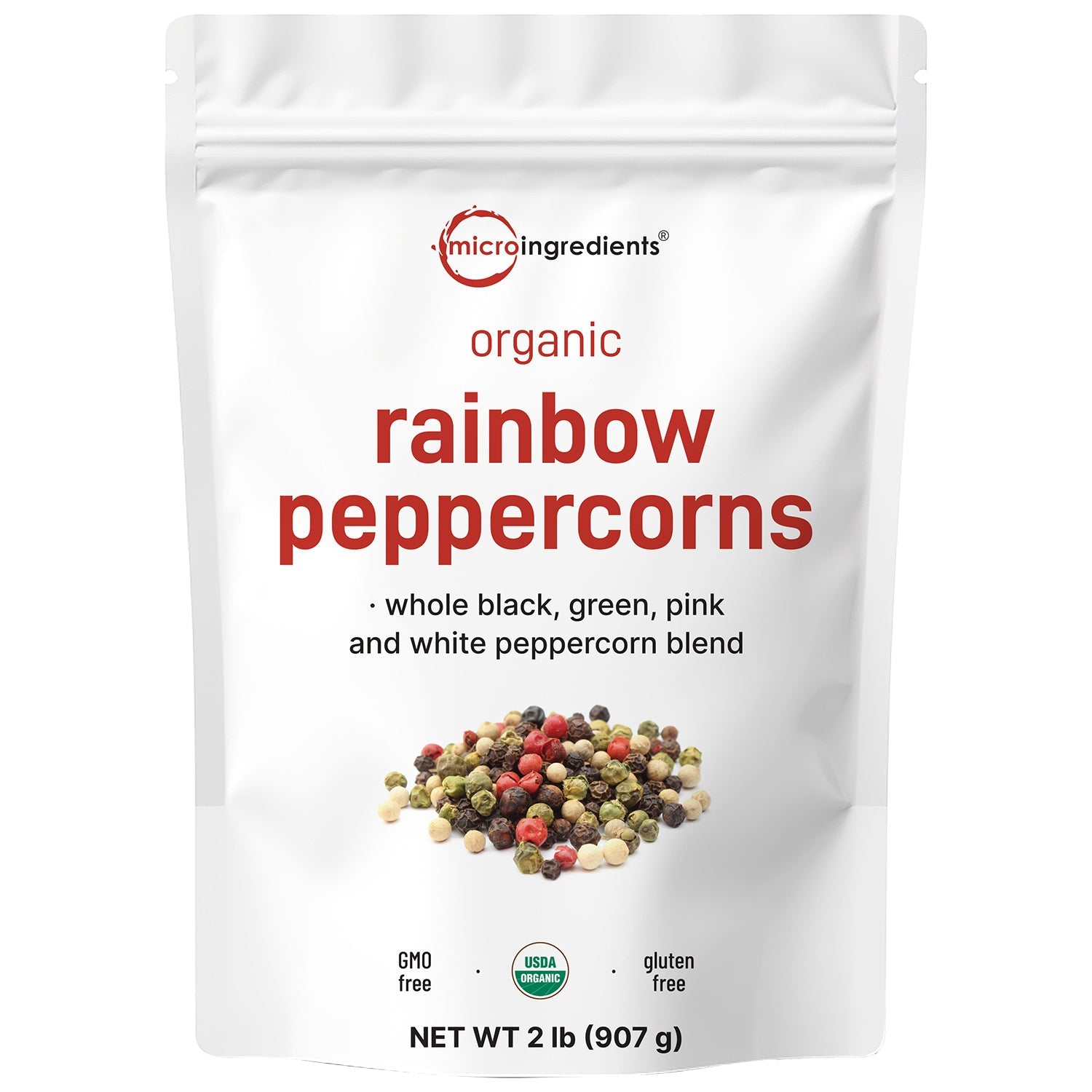 Micro Ingredients Organic Rainbow Peppercorns: a vibrant mix of whole black, green, pink, & white peppercorns. This blend elevates dishes with rich, multi-dimensional flavors and captivating visual appeal.