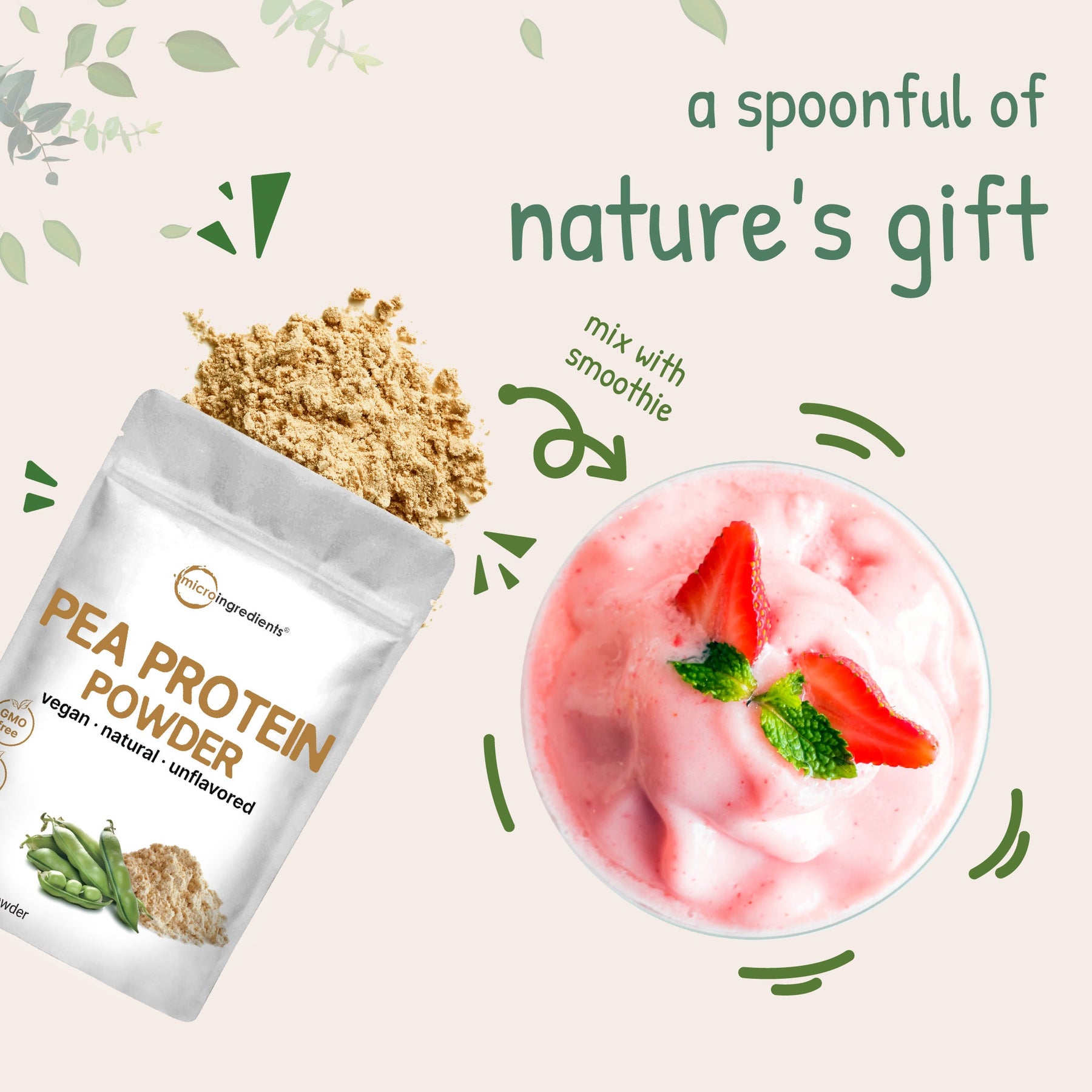 Micro Ingredients offers premium North American farm grown vegan-friendly pea protein powder, 100% raw and unadulterated, rich source of complete proteins, unflavored and unsweetened for easy mixing.